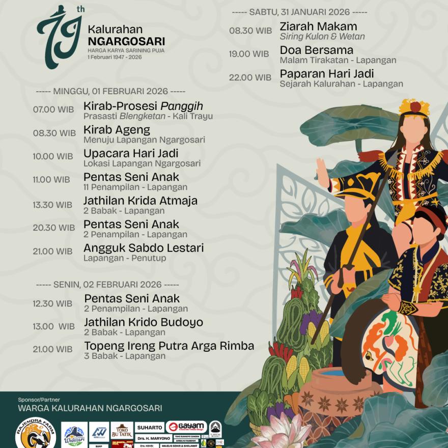 Oleh karena itu, kami mengundang seluruh masyarakat Ngargosari untuk turut serta mangayubagyo, hadir, dan menyukseskan hajatan besar kita bersama ini. Mari kita jadikan momentum ulang tahun ke-79 ini sebagai titik tolak untuk semakin gumregah membangun desa, mempererat tali silaturahmi dalam semangat gotong royong, dan membuktikan bahwa dengan kebersamaan, Ngargosari mampu terus tumbuh menjadi desa yang berdaya, mandiri, dan berbudaya.
